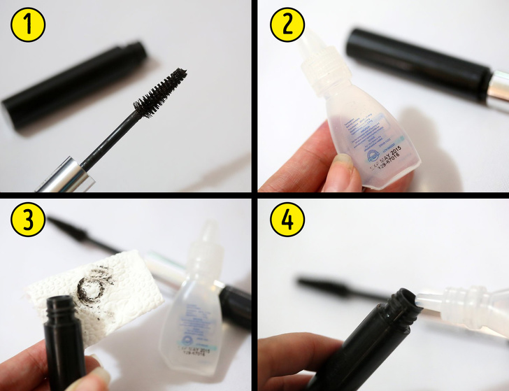Очевидно, що очні краплі абсолютно безпечні для ваших очей, так що ви сміливо можете використовувати їх, щоб розвести туш. На відміну від води, вони не містять бактерій і діють навіть на водостійку туш. Тільки не лийте занадто багато, інакше ваша туш розтечеться по всьому обличчю.