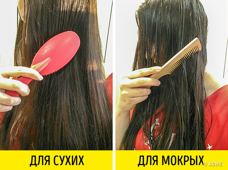Мокре волосся зазвичай взагалі не рекомендується розчісувати, так як в цей момент вони дуже уразливі для пошкоджень. І все ж таки робити це можна, але трохи згодом, коли вони трохи підсохнуть, і обов'язково гребінцем із широкими зубцями, дуже акуратно, не висмикуючи заплутані волосся.
