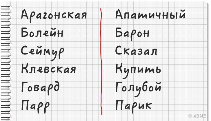 Щоб полегшити завдання, відкинемо імена, тим більше що трьох з них звали Катеринами, і можна запам'ятати, що так звали першу і двох останніх дружин Генріха. До речі, виявилося, що якщо запам'ятати прізвища, імена автоматично до них «прикріпити». Залишилося тільки придумати лічилку. І раз вже ми говоримо про короля, придумаємо щось що відноситься до аристократів: