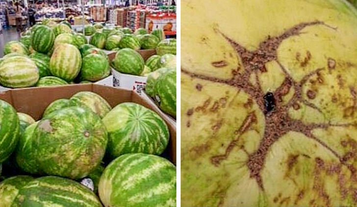 Такі бежеві "шрами" на гладкій шкірці кавуна - це місця, де бджоли намагалися спробувати м'якоть. Користувачі інтернету перевірили і вирішили, що такий кавун часто буває дуже солодким.