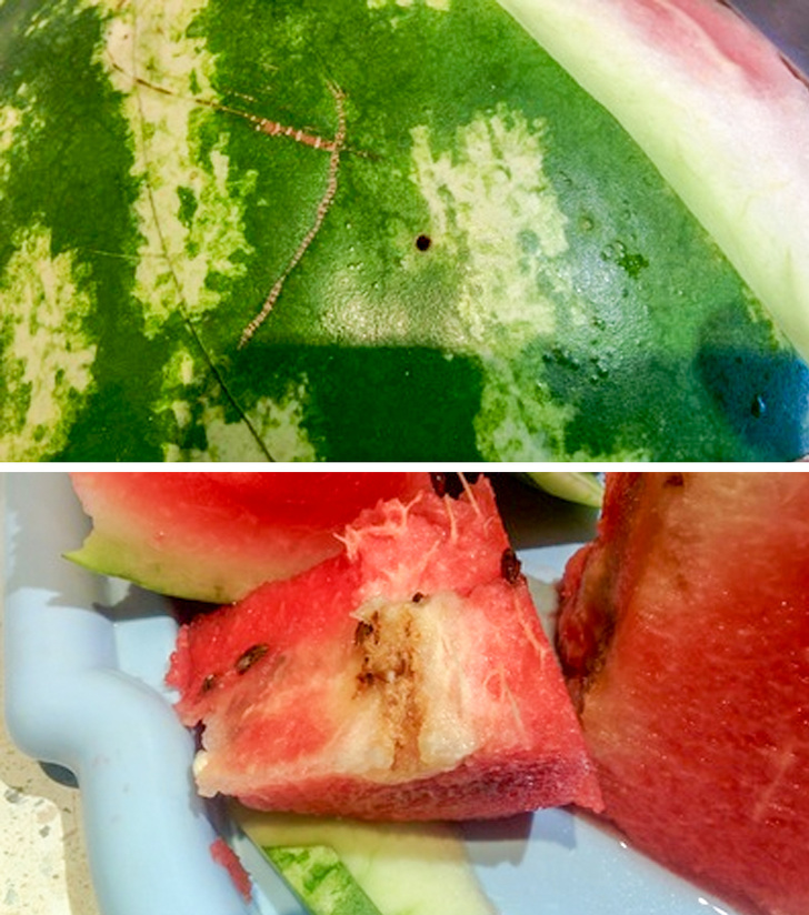 Розриви м'якоті говорять про те, що плід перезрілий або містить гормони росту. Перестиглий кавун може злегка гірчити, а кавун з гормоном росту - викликати отруєння. Тому такі ягоди краще не їсти.