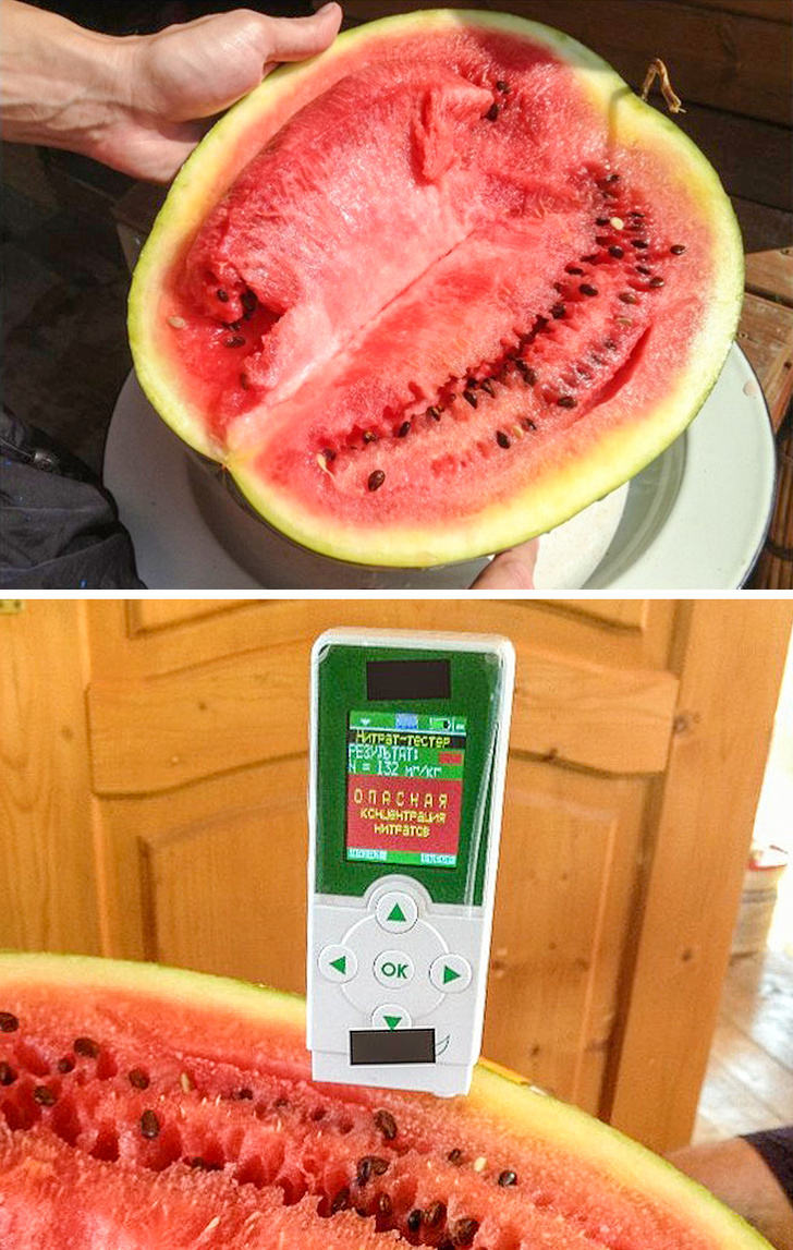 Азот — це важливий для росту і розвитку рослин елемент. Баштанники, застосовуючи його з перевищенням допустимих норм, отримують за 3 тижні плід вагою до 10 кг Покупець може отруїтися після вживання такого плоду. Тому звертайте увагу на колір кірки при розрізі кавуна: вона не повинна бути жовтою. А в м'якоті смачного кавуна не може бути білих прожилок.