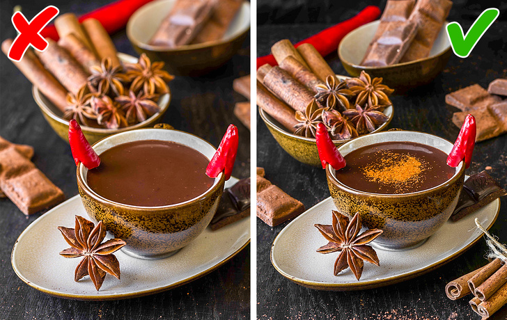 Поєднайте какао, багате антиоксидантами, з кайенским перцем або чилі, який знижує апетит, покращує метаболізм і сприяє більш активного окислення жирів (в ході якого жири розщеплюються на жирні кислоти перетворюються в енергію), і разом вб'єте двох зайців: задовольните свої смакові рецептори і не нашкодите фігурі.