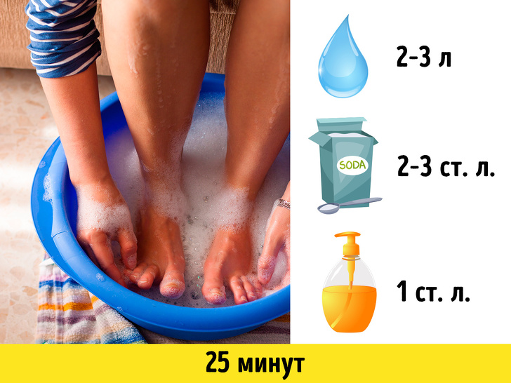 Як робити. У 2-3 л теплої води додаємо 2-3 ст. л. соди і 1 ст. л. рідкого мила. Опускаємо ноги у ванночку і тримаємо 25 хвилин, щоб шкіра як слід розм'якла. Потім витягуємо ноги і за допомогою пемзи або пилки видаляємо ороговілий шар з мозолі. Після завершення процедури змащуємо стопи пом'якшувальною кремом з антисептиком: ромашкою, календулою або евкаліптом.