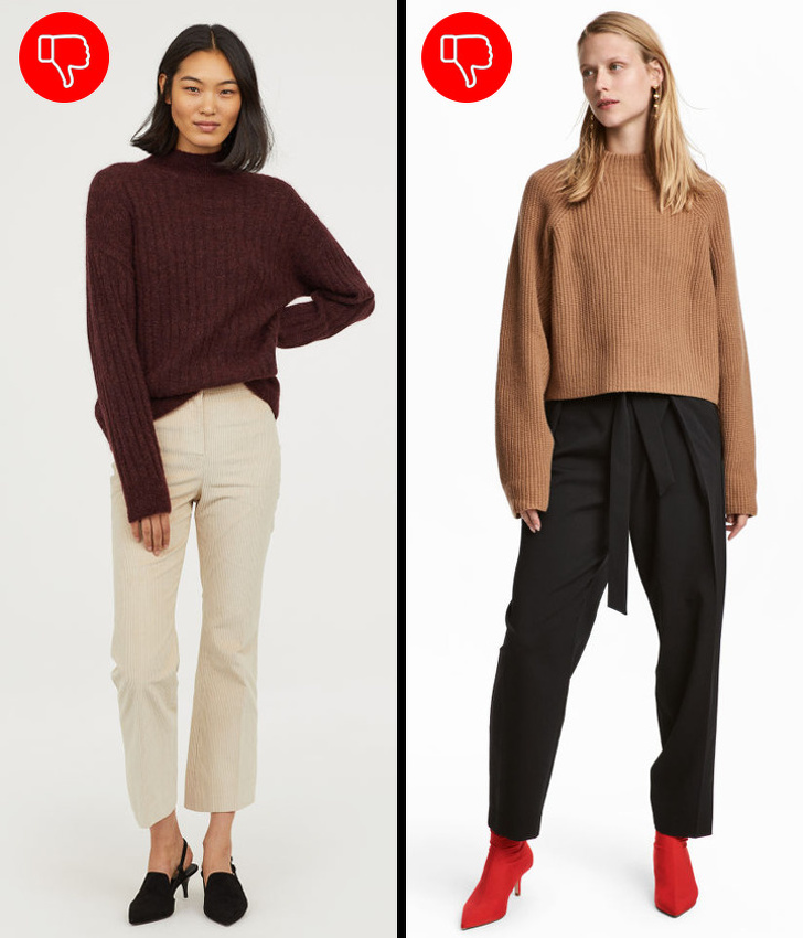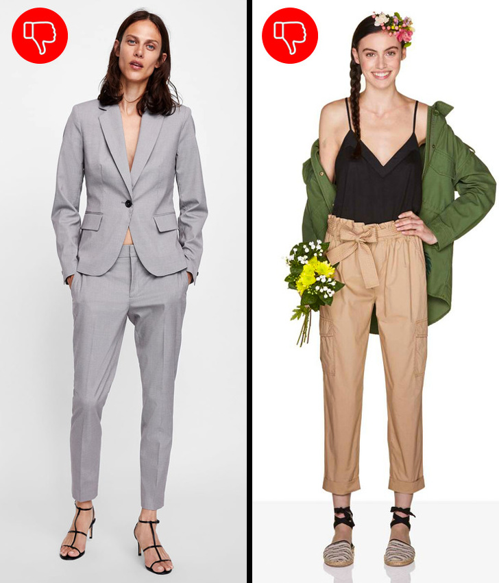 - блузках, заправлених у штани (створюється непотрібний обсяг в районі талії).