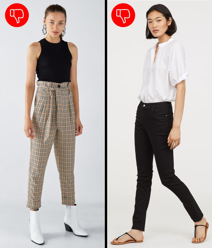 Відвернути увагу від зайвого об'єму в районі живота допоможуть моделі з високою талією, а ось форма штанів підкреслить стрункі стегна і ноги. Якщо ж живіт занадто виступає, створюйте образи з блузами і жакетами, які прикриють його.