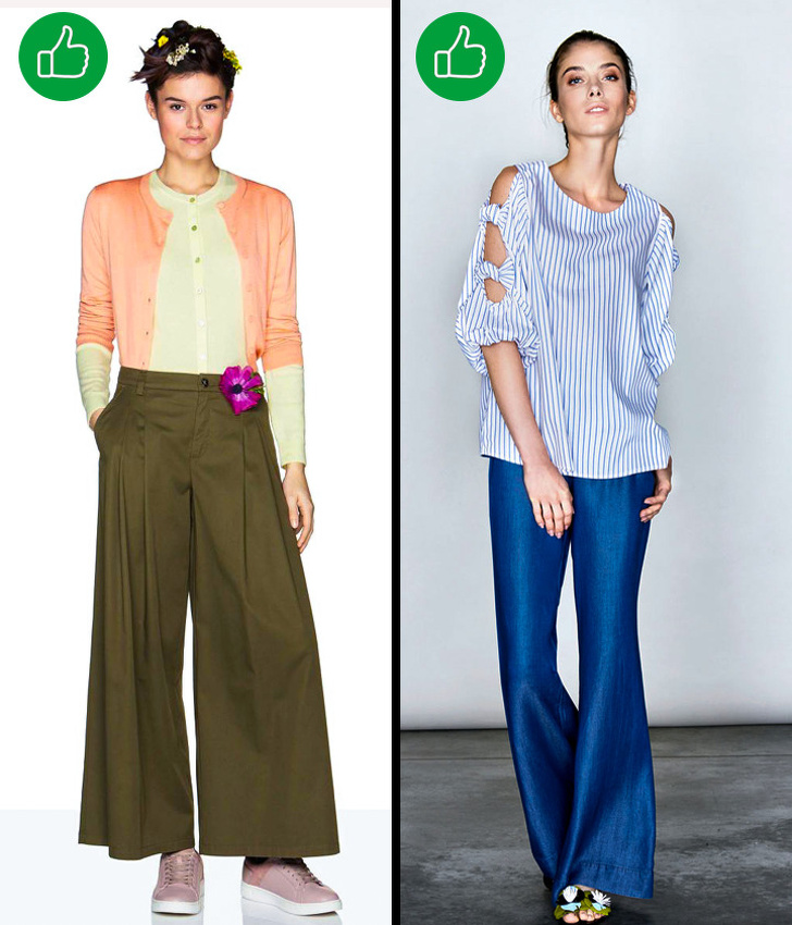 - розкльошені брюки від стегна (дуже широкі моделі підуть тільки високим дівчатам);