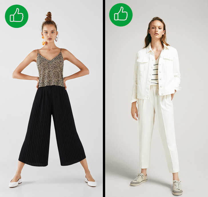 - розкльошені брюки від коліна (слідкуйте, щоб найширша частина штанів була вже стегон, інакше фігура здаватиметься громіздкою;