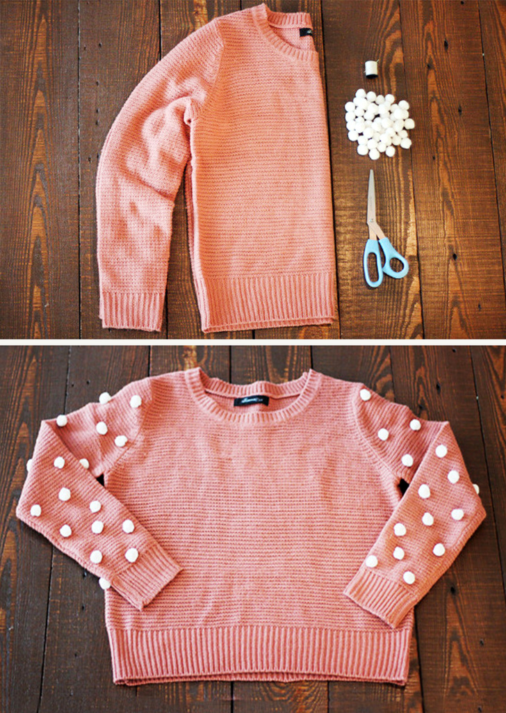 Оновити старий светр можна, пришивши до нього невеликі помпончики, які можна купити в будь-якому магазині для рукоділля.