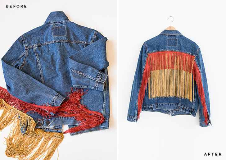 Звичайна синя джинсовці занадто нудна і хочеться яскравих фарб? Тоді ця ідея переробки для вас, знадобляться лише сама куртка, пара метрів бахроми і трохи терпіння.