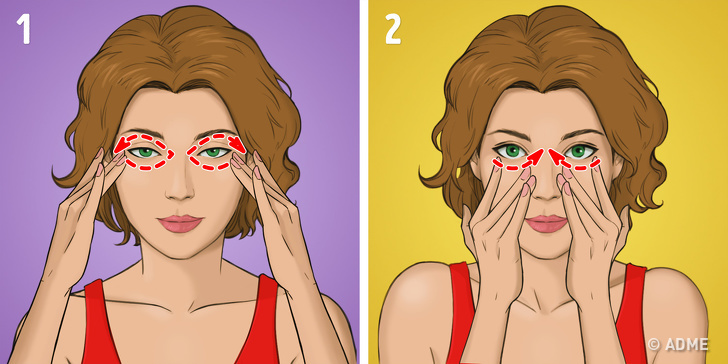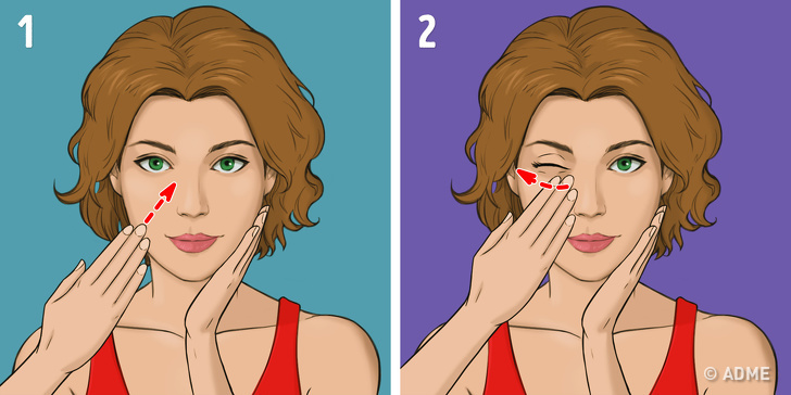 - Подушечками середніх пальців натисніть у зовнішніх куточків очей, обережно проведіть по нижньому століттю до внутрішніх куточків, зберігаючи натиск.