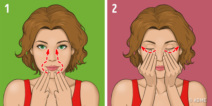 - Натисніть подушечками середніх пальців біля крил носа і проведіть напівкола до спинки носа і назад (мал. 2).