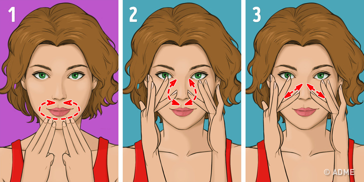 - Залишаючи великі пальці на місці, проведіть іншими від носа до скронь, трохи натягуючи шкіру (рис. 2).