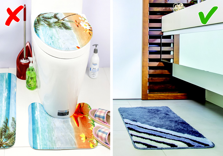 Дизайнери вимагають позбутися від килимків, які зазвичай лежать біля унітазу. Пам'ятаєте цей маленький половічок з виїмкою? «Зніміть це негайно», — кажуть декоратори і виявляються праві: це негігієнічно і негарно. Відмінною заміною послужить килимок прямокутний, розташований поряд з підставою унітазу.