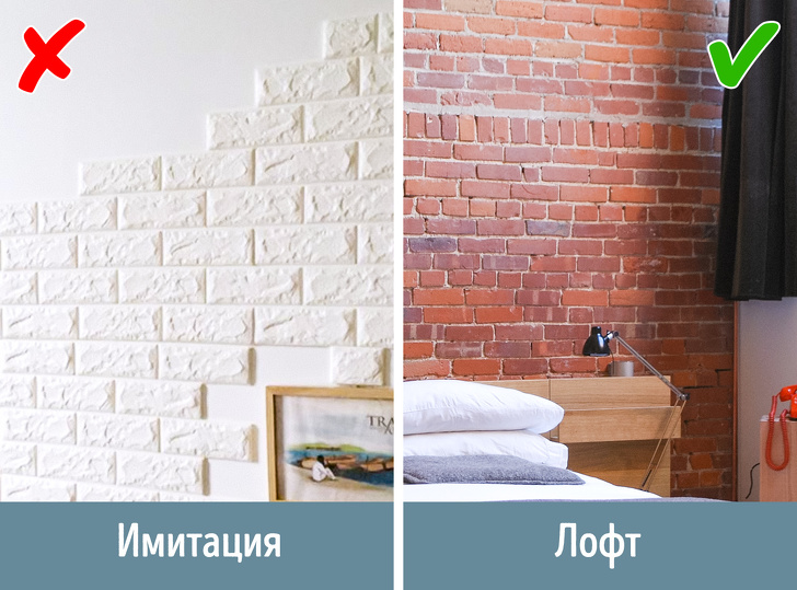 У список небажаних прийомів декору авторитетні дизайнери включили оздоблення кімнат декоративним цеглою. Використання штучних матеріалів робить інтер'єр неживим і глянсовим, що абсолютно не підходить для приміщення, в якому живуть люди.