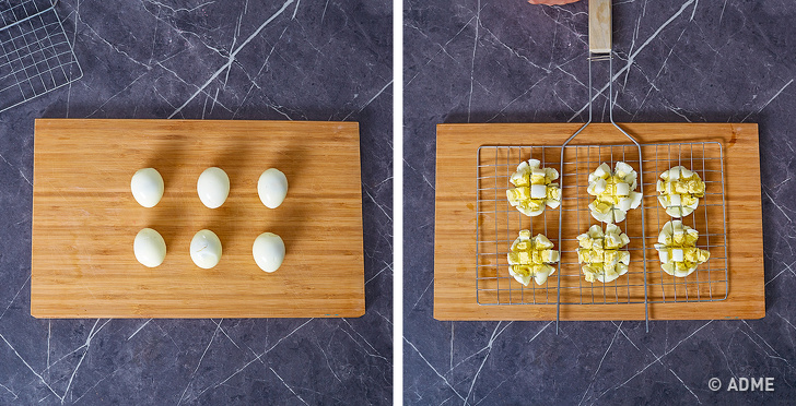 Різати яйця вручну досить клопітно: вони постійно розвалюються на частини. У цьому випадку на допомогу господиням приходить яйцерезка, але навіть в ній доведеться різати кожне яйце окремо. А покришити одночасно всі яйця без зайвих зусиль можна за допомогою дрібної решітки для гриля.
