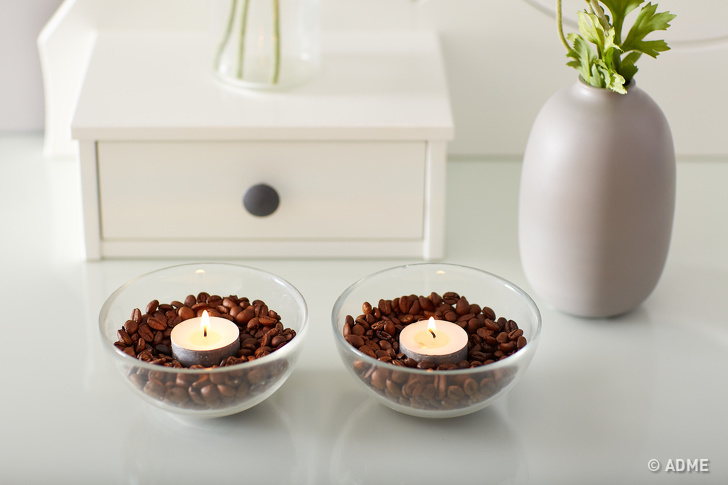 Якщо запалити свічки-таблетки в чашках, наповнених зернами кави, зерна почнуть нагріватися і видавати ледь відчутний приємний кавовий аромат.