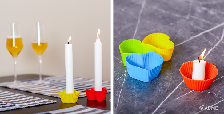Романтична вечеря при свічках можна влаштувати навіть у тому випадку, якщо у вашому будинку немає жодного підсвічника. Якщо свічки досить стійкі, замість свічників можна використовувати силіконові форми для випічки: вони захистять стіл від потьоків воску. До формочках віск, до речі, практично не прилипає, тому почистити їх і далі використовувати за призначенням буде зовсім нескладно.