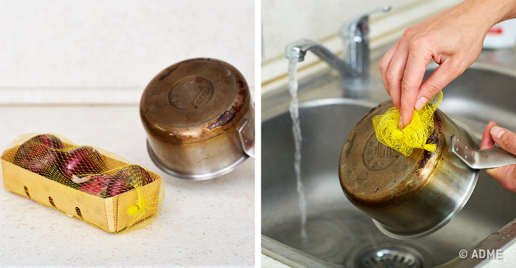 Сітки, в яких продаються фрукти і овочі, ви можете використовувати повторно. Наприклад, з їх допомогою можна відмити металевий посуд, не подряпавши її.