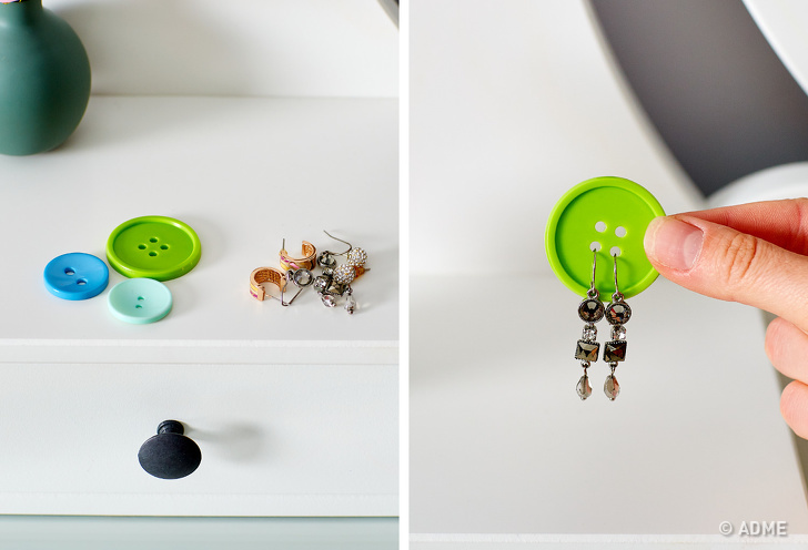 Щоб у скриньці з прикрасами не було бардаку і не доводилося шукати пару до сережці, можна зберігати сережки, просмикнувши їх через гудзик. Так сережки з одного комплекту завжди будуть залишатися поруч.