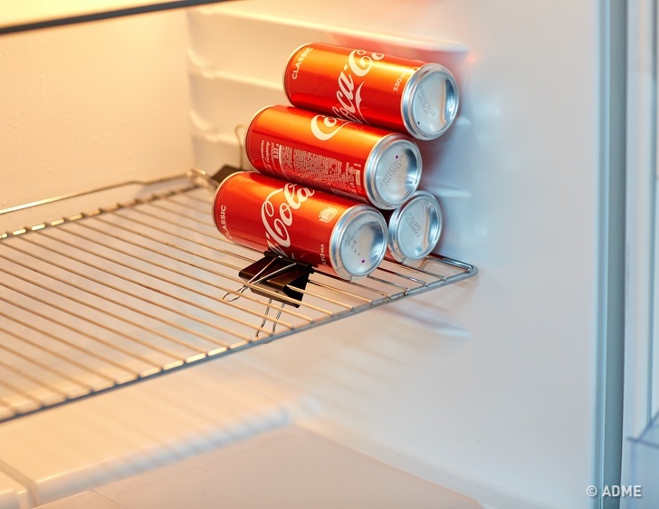 Існує безліч варіантів використання канцелярських затискачів. Ось один з них: закріпіть на полиці холодильника один великий затискач і покладіть поруч з ним пляшку або жерстяну банку. Ви навіть можете скласти з них цілу піраміду: банки будуть упиратися в затиск і не рознесеться по всій полиці.