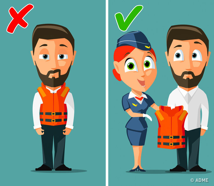 Навіть якщо на борту паніка і хаос, слухайте команди стюардеси і пілота. Якщо літак вдалося успішно посадити, варто уникати спокуси відразу кинутися до виходу, потрібно чекати вказівок екіпажу. Наприклад, при посадці на воду вам скажуть, що не варто надягати рятувальний жилет відразу. Якщо цього не почути, можна потрапити в пастку, у разі якщо літак почне наповнюватися водою. Якщо все ж таки це сталося, зніміть рятувальний жилет і просто за нього триматися. До речі, він з легкістю витримає двох пасажирів.