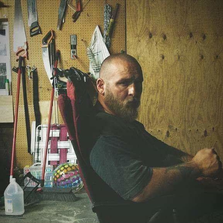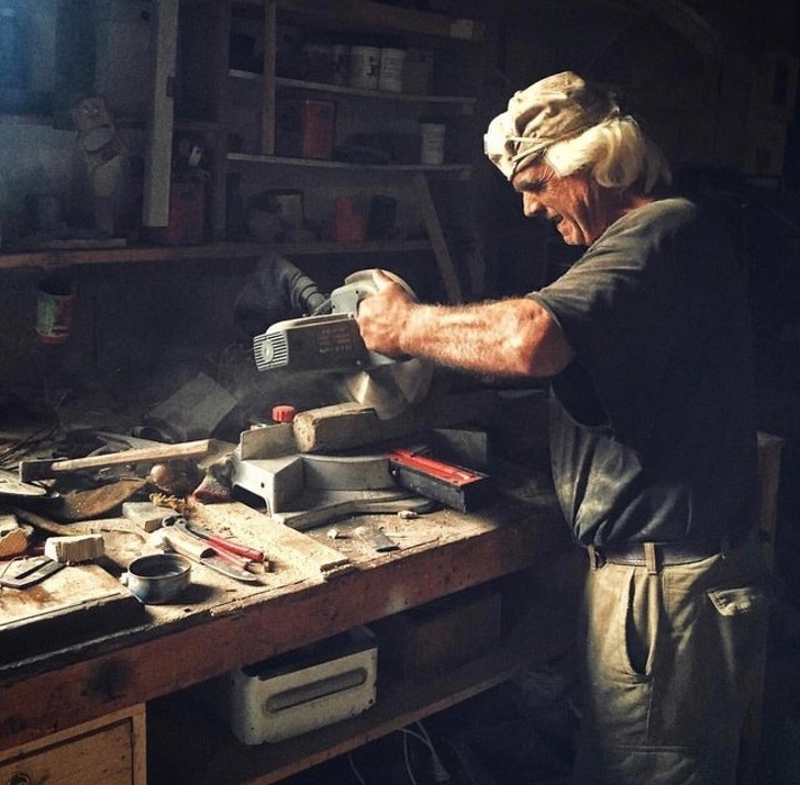 12. Фотографія в гаражі. Головний герой схожий на рицаря, який повернувся з хрестового походу