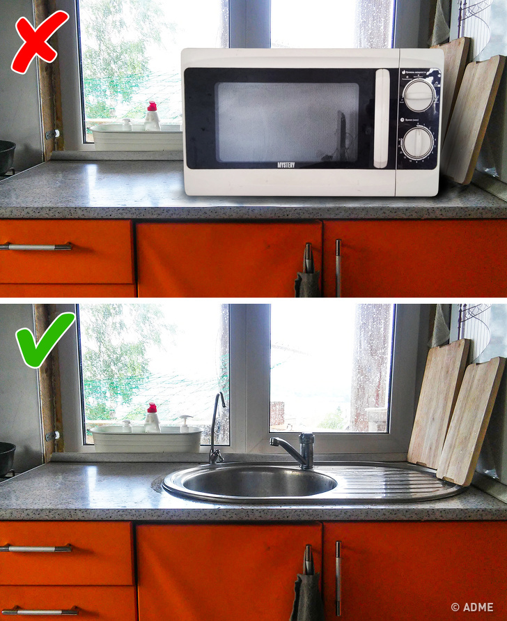 - Для мікрохвильовки набагато більше підійде окрема полиця на стіні. А простір біля вікна можна використовувати для облаштування додаткової робочої зони.