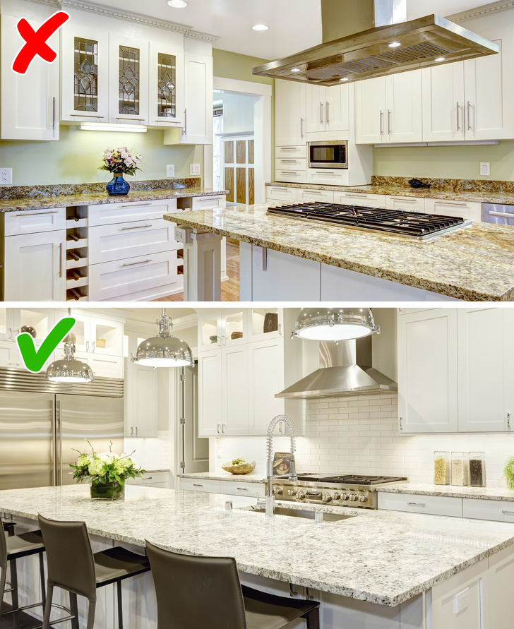 Навіть якщо розміри приміщення дозволяють розмістити кухонний острів з плитою в середині кімнати, краще відмовитися від цієї ідеї. Якщо що-то расплещется на плиті — доведеться відмивати майже всю кухню цілком. А якщо плита стоїть впритул до стіни, потрібно буде лише протерти кухонний фартух і підлогу перед плитою.