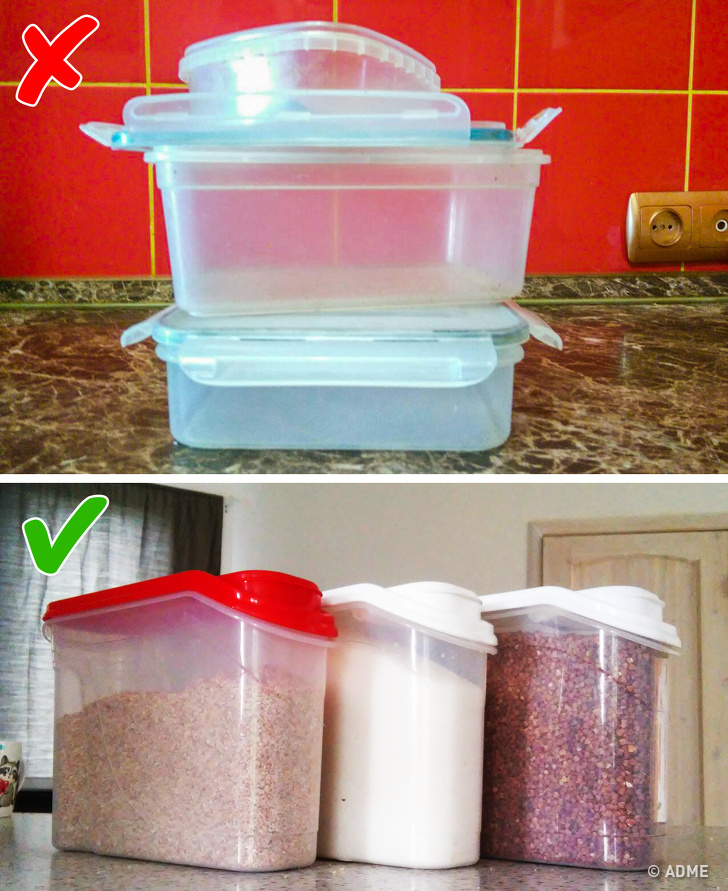 Кілька контейнерів для зберігання круп — це практично, але стопка невикористовуваних пластикових коробок — це баласт, який займає корисне місце на кухні. Контейнери для харчових продуктів, що призначені для одноразового використання, не підходять для повторного зберігання продуктів харчування.