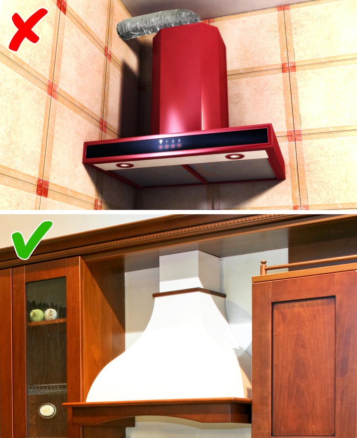 - Хорошою альтернативою може стати пластикова система вентиляції: її легше підтримувати у чистому стані — досить просто час від часу протирати вологою ганчіркою. Інший спосіб захистити себе від незручного пилозбірника — вибрати кухонний гарнітур до стелі і заховати труби вентиляції за стулками шафи.