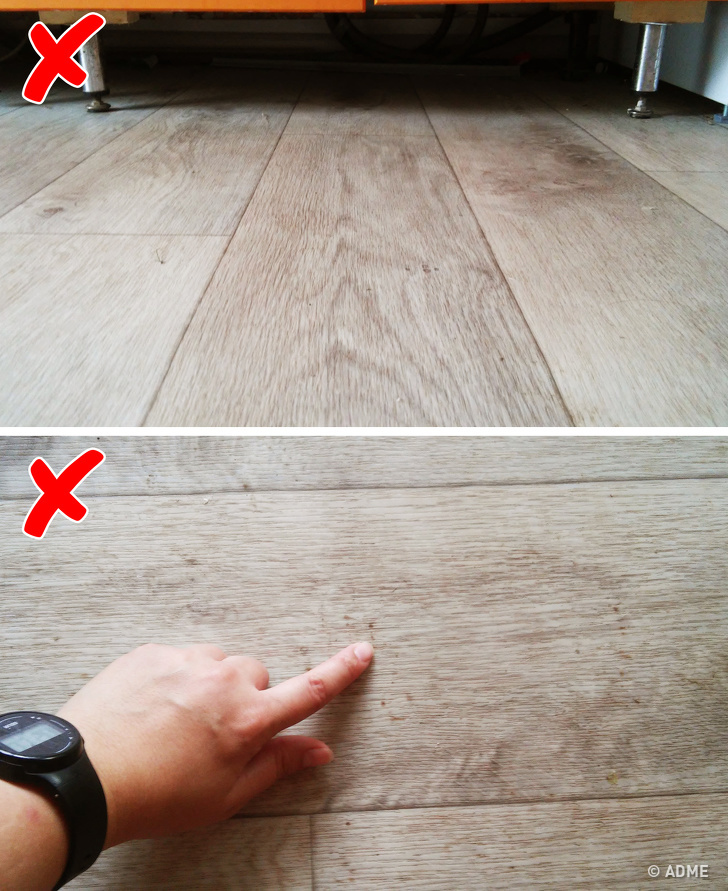 Кожен виступ на підлозі кухні — це магніт для бруду. Суміш пилу з найдрібнішими крапельками жиру буде затримуватися в фасці між дошками паркету, заб'є поглиблення рельєфного лінолеуму.