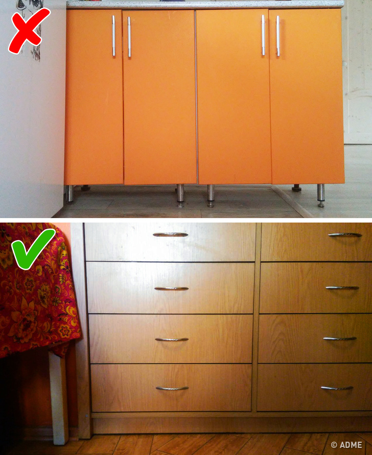 Під кухонними шафами з вузькими щелочками між шафою і підлоговим покриттям буде накопичуватися пил, шерсть домашніх тварин, дрібне сміття, бруд. Щоб забратися в цих важкодоступних місцях, буде потрібно багато часу і вправність.