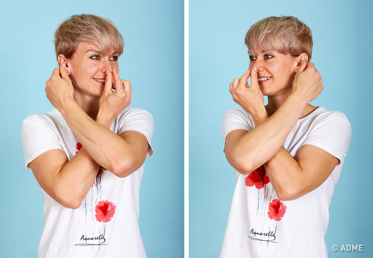 Це вправа на перший погляд здається простим. Всього-то й потрібно пальцями правої руки доторкнутися до свого носа, а лівою рукою взяти себе за праве вухо. Потім грюкнути в долоні і поміняти положення рук: ліва — на ніс, права — на ліве вухо.
