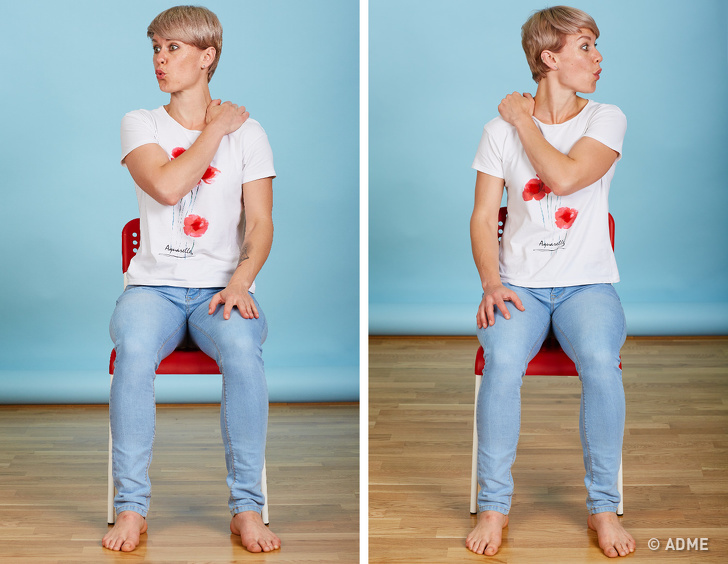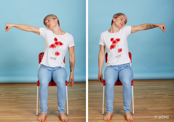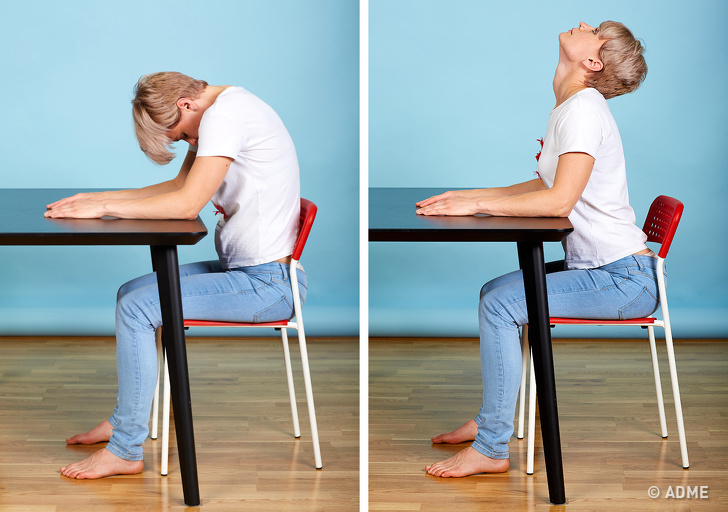 Прекрасний засіб для того, щоб розслабити м'язи шиї і плечового пояса, змучені сидячою роботою. Покладіть Руки на стіл і повільно опускайте підборіддя вниз, поки він не опиниться на грудях. Залишайтеся в такому положенні декілька секунд, потім, з глибоким вдихом, підніміть голову, закиньте, розправте плечі, максимально розкриваючи грудну клітку. Руки залишаються на столі. На видиху розслабтеся. Повторіть вправу ще двічі.