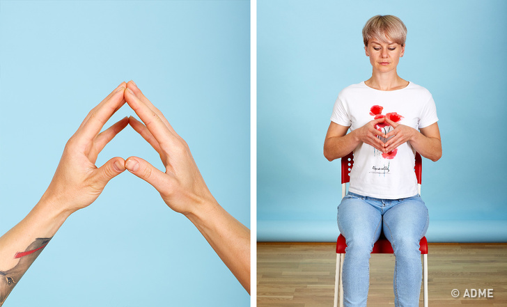 Сидячи на стільці, максимально випросталась. Схрестіть ноги: щиколотки лівої ноги повинна розташовуватися поверх щиколотки правої ноги. З'єднайте пальці рук в замок - великий палець правої руки повинен бути поверх великого пальця лівої руки. Виверніть долоні навиворіт, щоб вони опинилися перед грудьми. Притисніть кінчик язика до неба і затримайтеся в такому положенні на кілька хвилин, дивлячись прямо перед собою.