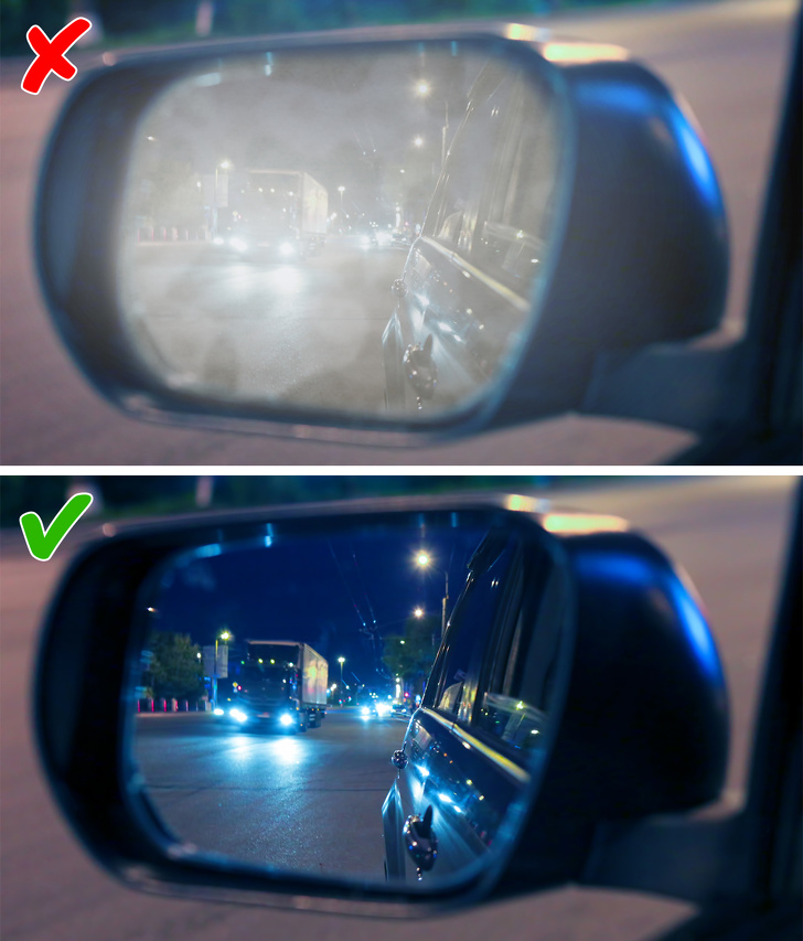Брудні дзеркала відбивають світло від автомобілів позаду вас у більш широкій, розсіяною формі, що може сприяти появі зайвих відблисків. Крім того, варто заздалегідь подбати про те, щоб не тільки почистити, але і правильно налаштувати їх. Найкраще направляти їх злегка вниз, щоб бачити автомобілі позаду, злегка нахиляючи голову вперед, але не дозволяти їм тимчасово засліпити вас своїм світлом.