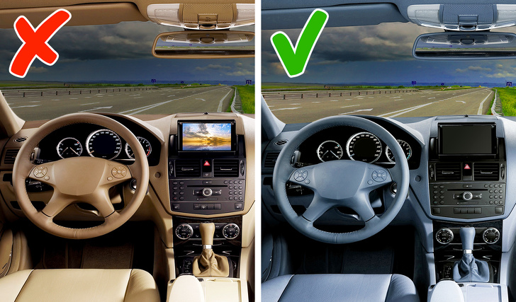 І, звичайно ж, не залишайте включеними будь-які інші електронні предмети, будь то мобільний телефон або навігатор. Світло від будь-якого екрану неминуче відкидає відблиски, що також створює небажаний відволікаючий ефект.