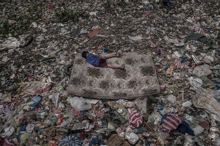 Хлопчик, що збирає переробляються відходи, лежить в оточенні сміття на матраці, який пливе по річці Пасиг в Манілі (Філіппіни). З 1990-х років річка Пасиг була визнана біологічно мертвою через побутових і промислових відходів, які в неї скидають. Незважаючи на те, що робляться спроби врятувати річку, до цих пір в деяких місцях зберігається таке скупчення сміття, що по ньому можна ходити.