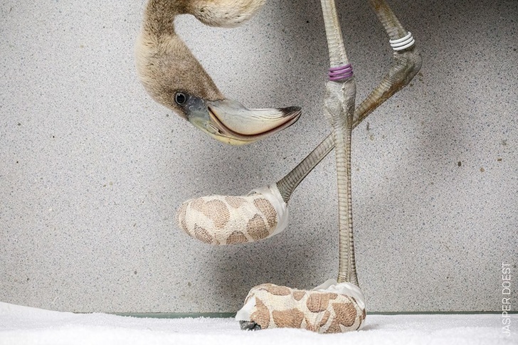 Карибський фламінго оглядає імпровізовані шкарпетки, які зробили для того, щоб полегшити біль від важких ушкоджень стоп. Такі поразки поширені серед полонених фламінго, так як у них дуже чутливі лапи і вони звикли ходити по м'якому грунті.