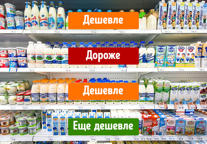 Щоб магазин якомога менше втратив на «прострочення», його співробітники стежать за тим, щоб продукти з терміном придатності перебували на краю вітрини. Висновок простий: не лінуйтеся потягнутися до верхніх полиць, нагнутися до нижніх і заглянути вглиб стелажа, якщо хочете придбати якісний, свіжий і недорогий продукт.