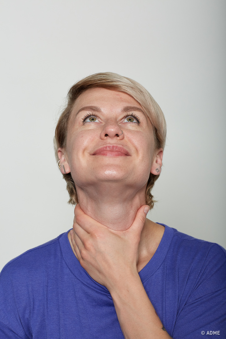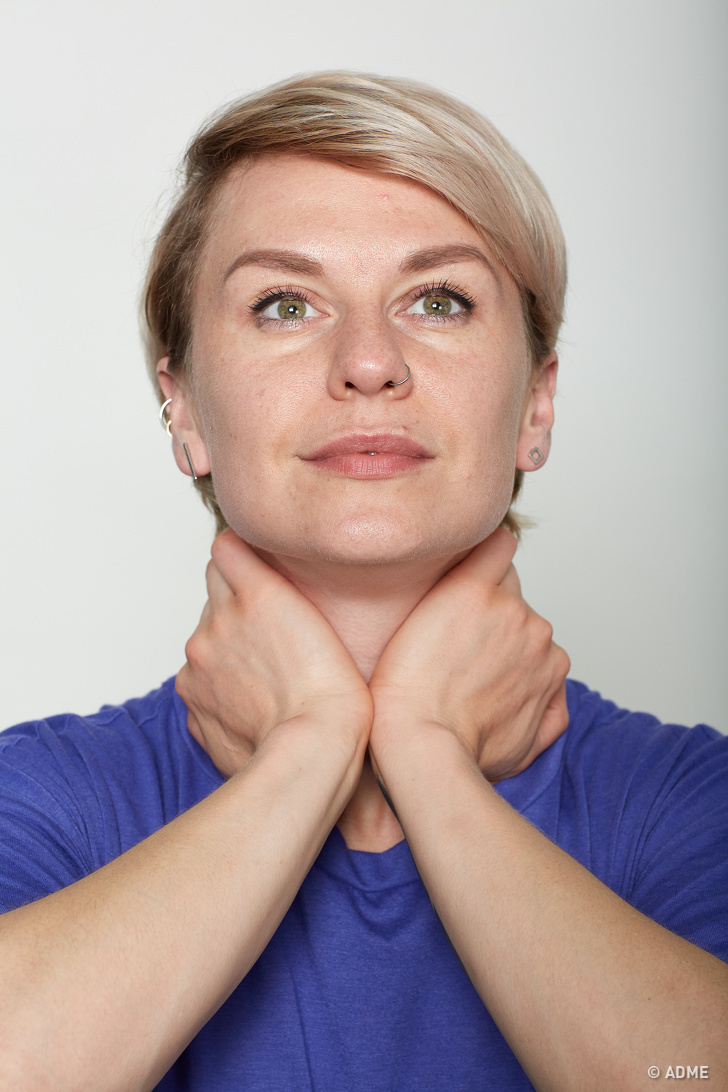 Сядьте прямо, високо піднявши підборіддя. Зімкніть губи і енергійно посміхніться, не показуючи зуби. Потім обхопіть руками шию біля основи над ключицями і злегка потягніть шкіру вниз. Спрямуйте погляд вгору. Відкиньте голову назад і відпустіть її, відчувши сильне натяг м'язів шиї і підборіддя. Порахуйте до 3 і поверніться у вихідне положення. Повторіть вправу 35 разів.