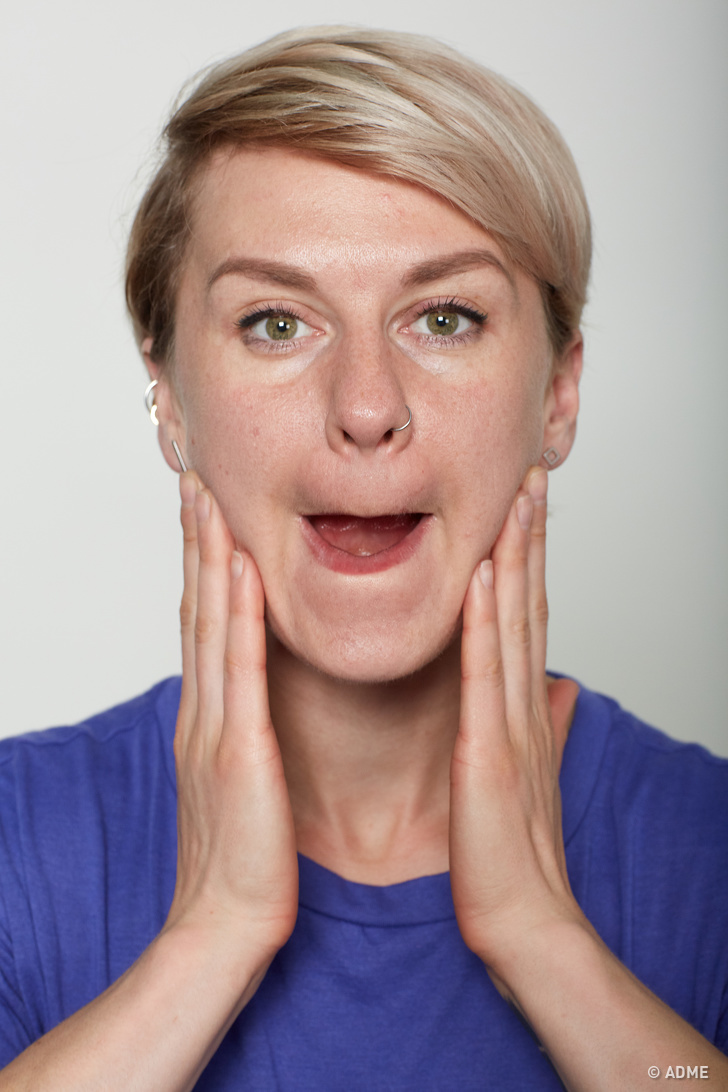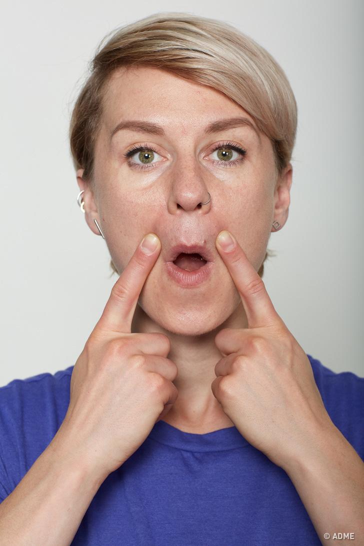 Цю вправу можна виконувати лежачи. Відкрийте рот, загорнувши губи всередину на верхні і нижні зуби. Покладіть руки з обох сторін щелепи, потім повільно проведіть ними вгору по бічних сторонах особи. Потім підніміть погляд вгору. Продовжуйте, поки не відчуєте печіння в бічних сторонах особи. Після цього підніміть руки вгору над головою і затримайтеся в такому положенні, рахуючи до 30.