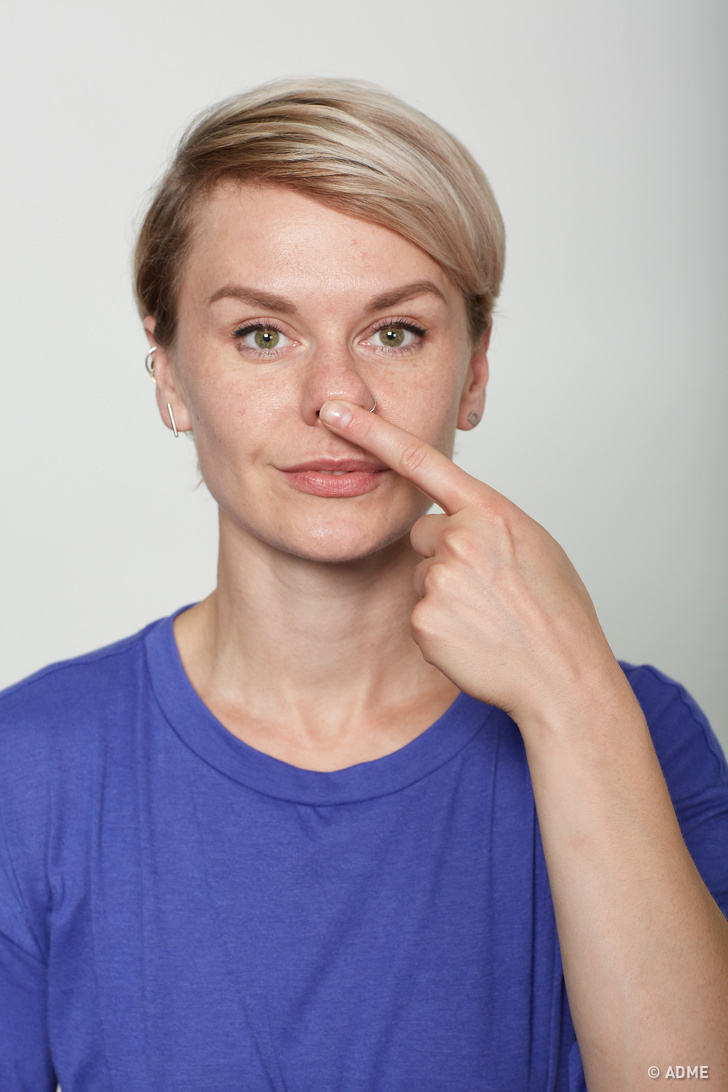 Вказівним пальцем підніміть кінчик носа догори. Відтягуючи вниз верхню губу, змусьте ніс зігнутися вниз. Ви відчуєте, як кінчик носа штовхає палець. Затримайтеся на секунду в цьому положенні. Розслабте губу, а потім повторіть вправу 35 разів. Зверніть увагу на дихання в цій вправі: воно повинно бути рівним, без затримок.