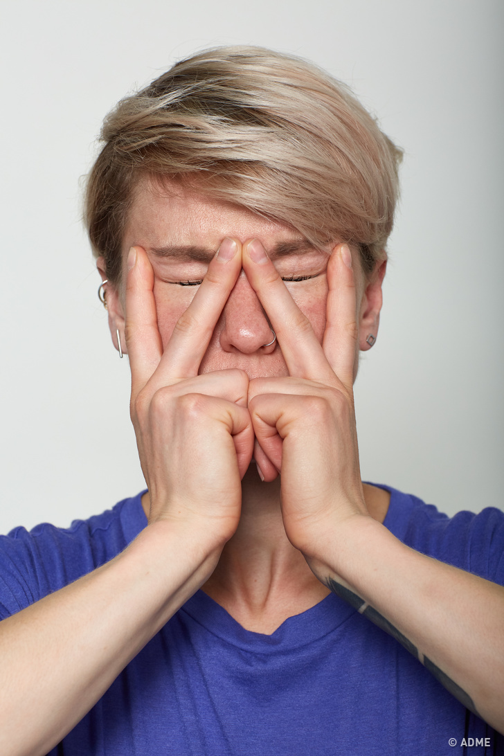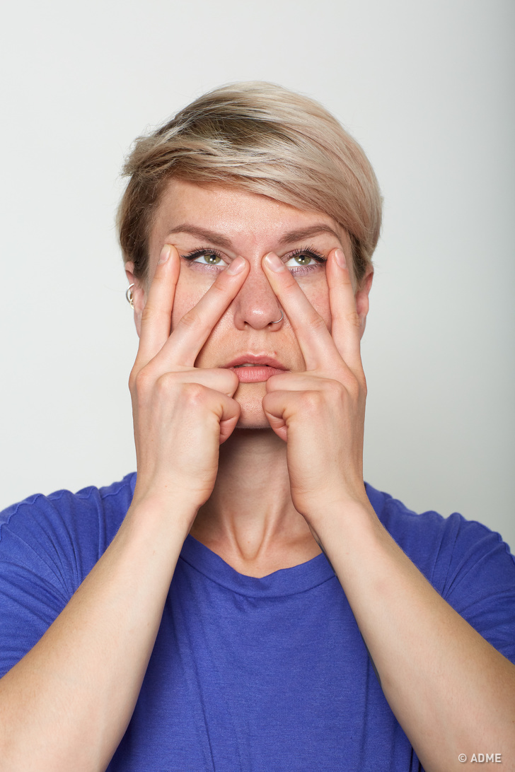 Середні пальці покладіть між бровами, над переніссям, а вказівні пальці — у зовнішніх куточків очей, злегка натискаючи на шкіру. Направте погляд вгору. Сощурьте нижню повіку, ніби підтягуючи його до верхнього.