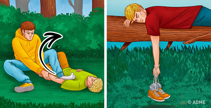 Кому-то: покладіть людини на землю і упріться ногою (без взуття) в пахву. Щільно обхопіть зап'ястя і починайте тягнути уздовж його тіла, поки не почуєте клацання. Не робіть це різко, як показують у фільмах, так можна пошкодити нерви, м'язи та сухожилля.