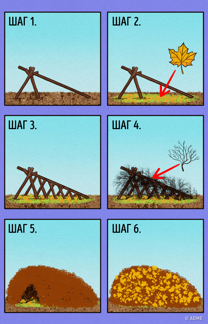 - З боків каркаса розмістіть міцні палиці, потім накидайте кілька шарів розгалужених гілок. І нарешті, покрийте шаром листя, придавивши зверху ще вітами. Забравшись всередину, закрийте прохід. У такому курені можна спати, не боячись замерзнути.