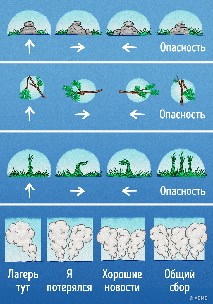 В дикій місцевості дуже легко заблукати. Тому буде корисно запам'ятати найпоширеніші позначення, які допоможуть знайти дорогу або попередити про небезпеку інших людей.