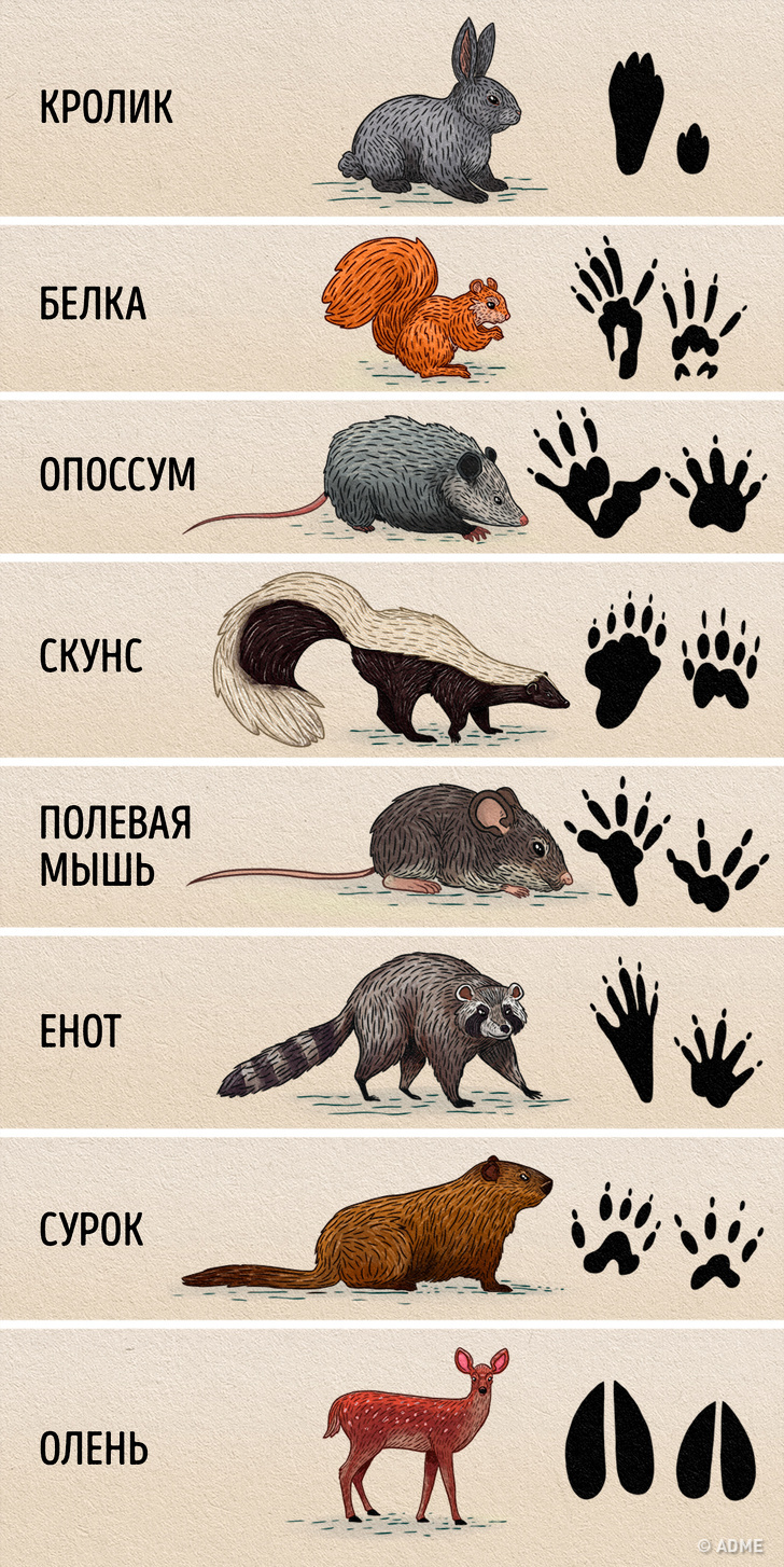 Для полювання або в якості захисту від хижаків буде корисно знати сліди диких звірів. Відбитки лап цих тварин легко помітити на мокрому грунті або на прим'ятій траві.