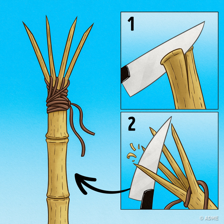 Якщо у вас немає пристосувань для лову риби, то залишається зробити гарпун. Знайдіть не занадто сухий, довгий і міцний стебло. Розщепіть його кінчик на 4 частини. Заточіть отримані зуби ножем або каменем і закріпіть за допомогою прута або мотузки. Тепер можна легко зловити рибу на мілководді.